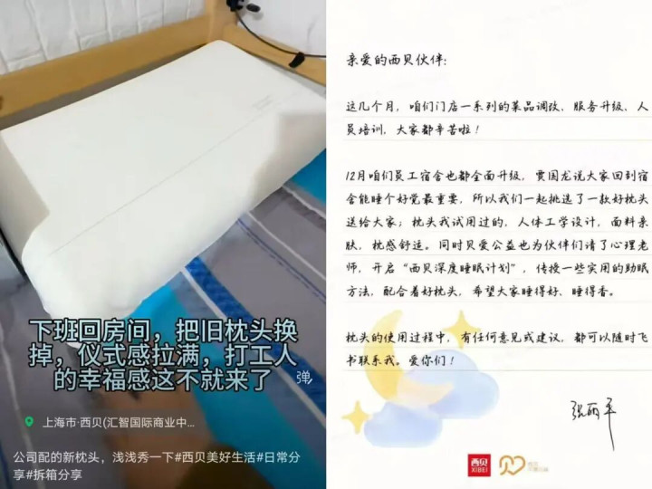 事实上,在这股舆论风波前后,我们似乎能瞥见西贝的“不变”——“笨拙的实在”。比如“老板闷声不画饼,吭哧吭哧给服务员发上万月薪”这一现象,在当下的就业环境下成了一种托底力量。据12月28日西贝员工在社交媒体上纷纷晒出的“送400多元枕头”的视频,贝爱公益给员工宿舍全面升级,请了心理老师,开启“西贝深度睡眠计划”。
